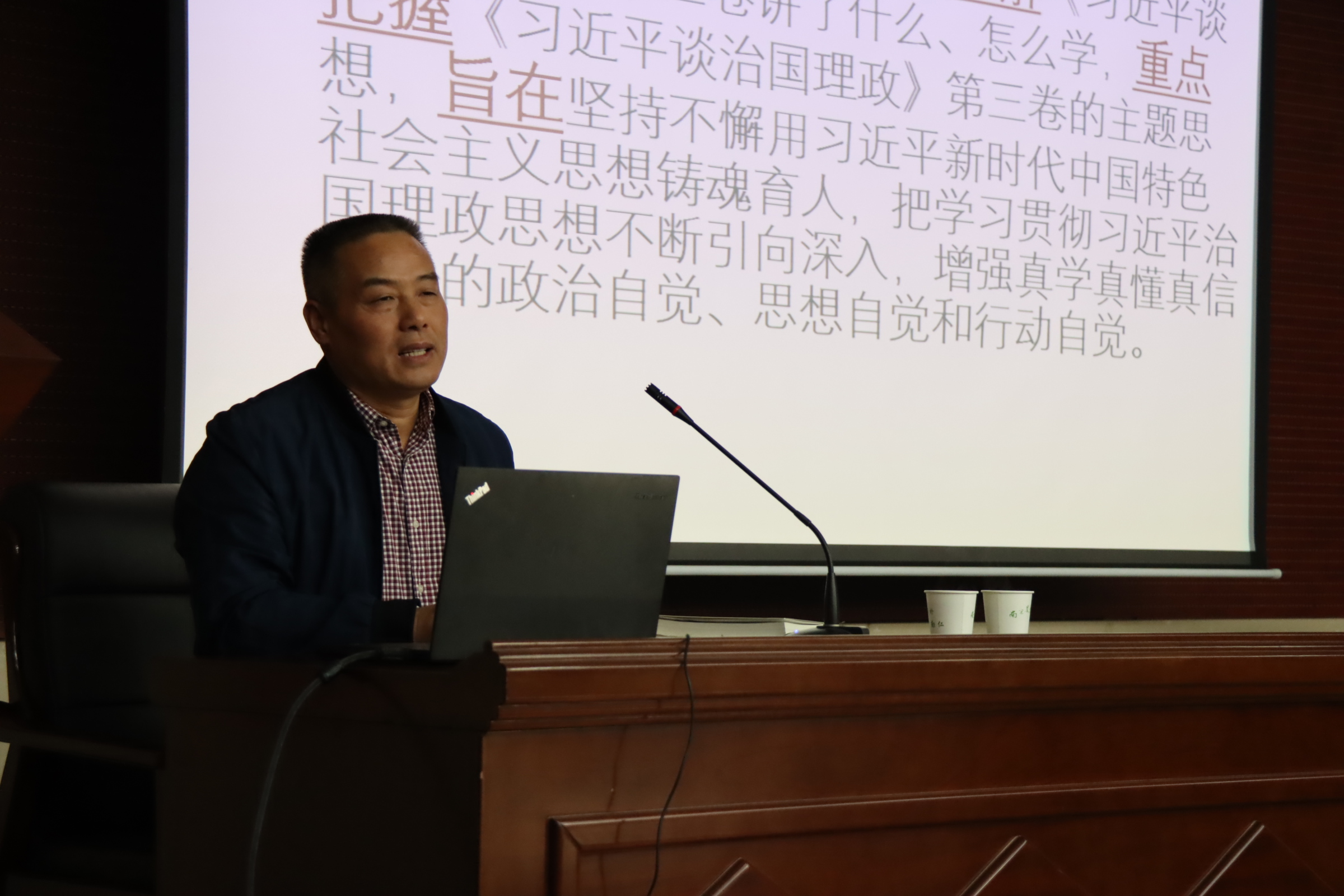 为认真落实学校深入学习《习近平谈治国理政》第三卷以及在全校师生中开展党史、新中国史、改革开放史、社会主义发展史学习教育等通知精神,充分发挥政治理论学习的重要作用,切实增强“四个意识”、坚定“四个自信”、做到“两个维护”,弘扬理论联系实际学风,提高广大党员干部政治理论素养、决策水平和工作能力,图书馆(文化遗产部)党总支结合工作实际,充分利用学校现有学科和师资资源,分别于10月23日、10月30日下午,联合继续教育学院党总支和国际教育学院直属党支部举办了两场专题理论辅导宣讲会,宣讲会分别邀请了马克思主义学院的吴国清教授和刘俊教授作专题讲座,图书馆(文化遗产部)党总支书记朱世桂主持了第一场宣讲会,三个单位的百余名党员认真参加了宣讲会学习。