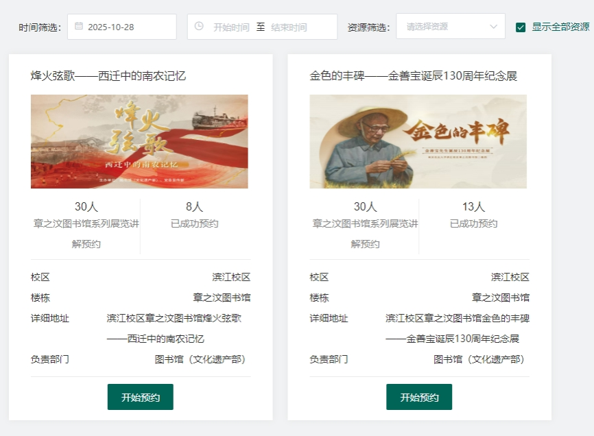 为更好地服务师生,引导师生深度走进南农校史,10月28日,图书馆(文化遗产部)正式开通章之汶图书馆系列展览讲解预约通道。