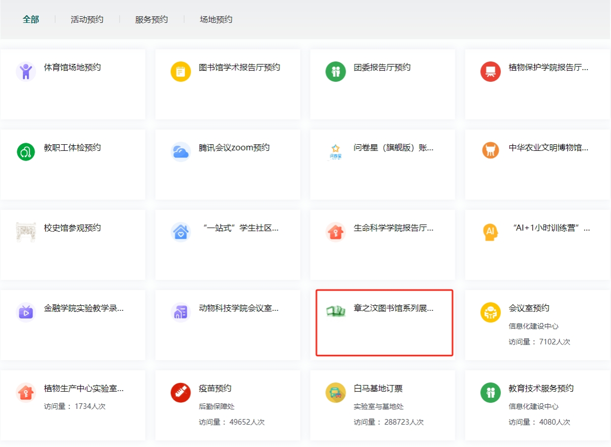 校内参观者可通过“智慧南农—师生服务”搜索“预约平台”,进入“章之汶图书馆系列展览”进行两场展览的预约。